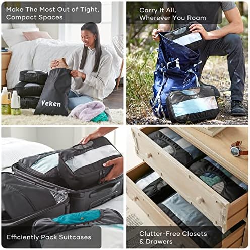 Upgrade your travel experience with the Veken 8 Set Packing Cubes for Suitcases. These luggage organizer bags not only simplify your packing process but also bring peace of mind knowing that your belongings are protected and readily available. With their sleek design, functional features, and durable construction, these packing cubes are a must-have for any traveler.,